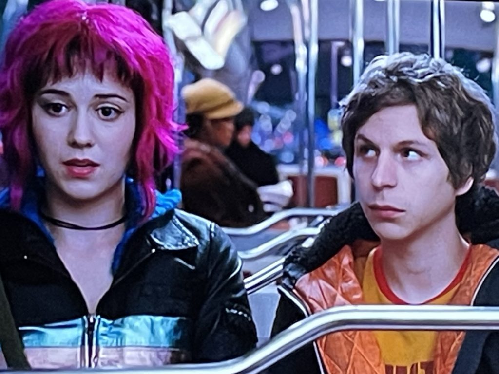 SCOTT PILGRIM VERSUS THE WORLD is a film co-written, produced and directed by Edgar Wright. It is based on the graphic novel series, Scott Pilgrim, by Bryan Lee O’Malley. The film plumbs issues surrounding a young man longing for love. Scott Pilgrim is in his mid 20s and coming off a breakup. He finds himself in a relationship with Knives Chau, a highschooler who adores him, then meets Ramona Flowers, a captivating twenty-something cool girl. To win her, he has to contend with Knives as current girlfriend as well as Ramona’s ex boyfriends.